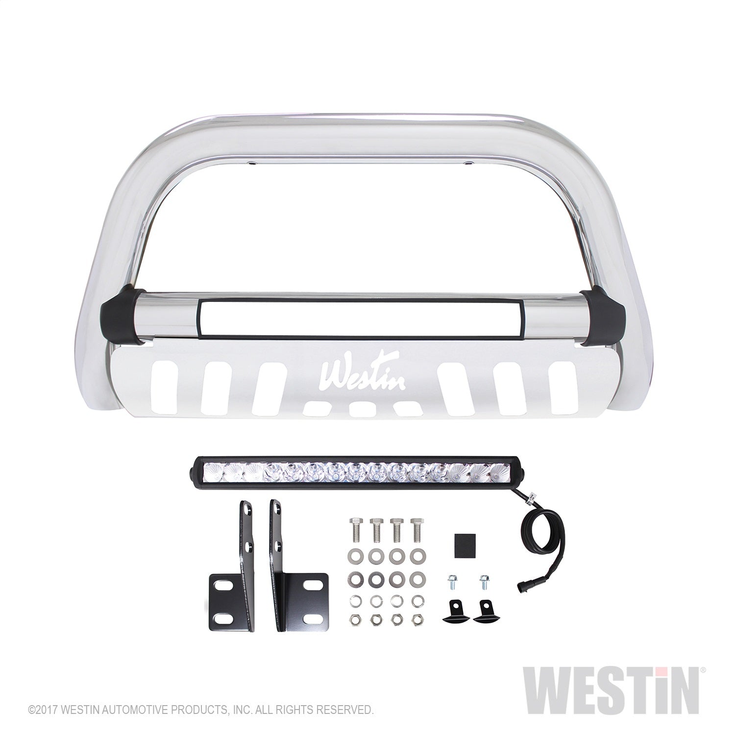 Westins Ultimate LED Bull Bar will take your truck to the next level with this cool new look! The integrated light bar is a 20 single row with 15 x 3 Watt Osram LEDs. The LED light bar is flush mounted in the center cross tube and weather sealed for moisture resistance. Built with 3 steel tubes, our Ultimate LED Bull Bar features molded transition bushings and a brushed stainless steel skid plate for a perfect look. The product is available in chrome plated stainless steel backed by a lifetime warranty, and in textured black powder coat backed by a 3-year warranty. Make a bold statement with Westins new Ultimate LED Bull Bar and give your truck the durability, look and style it deserves.