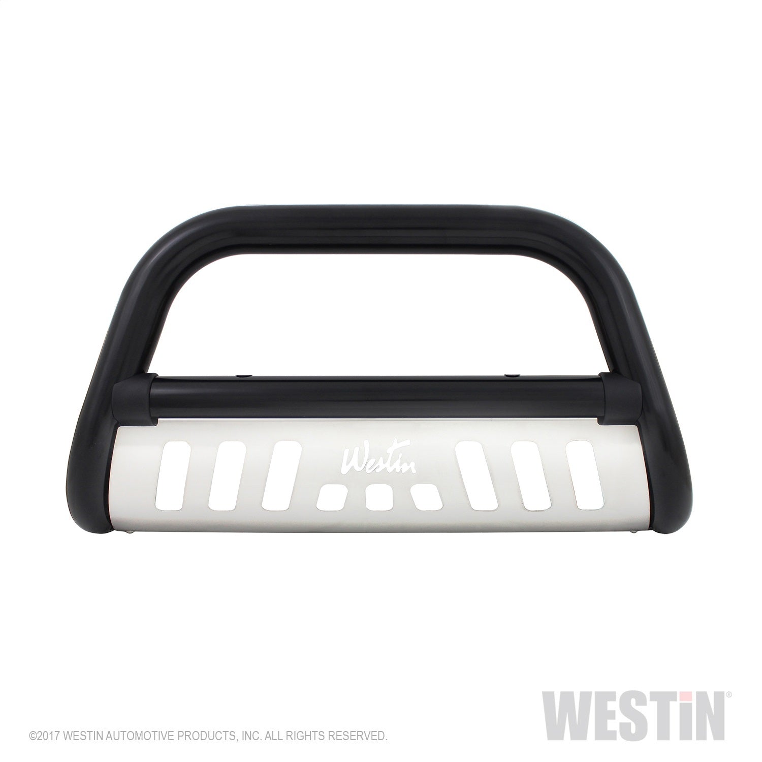 The Westin(TM) Ultimate Bull Bar is a front-end light bar made of 3in. diameter tubing for larger model trucks and SUVs and made of 2.5in. diameter tube for smaller trucks and SUVs. Product application is vehicle specific and comes complete with mounting kit. The Westin(TM)Ultimate Bull Bar features black molded caps on the crossbar welds for a finished and clean look. It features a stainless steel skid plate with a laser-cut Westin signature logo on it. Add a set of Westin(TM) Driving Lights for a complete customized look.