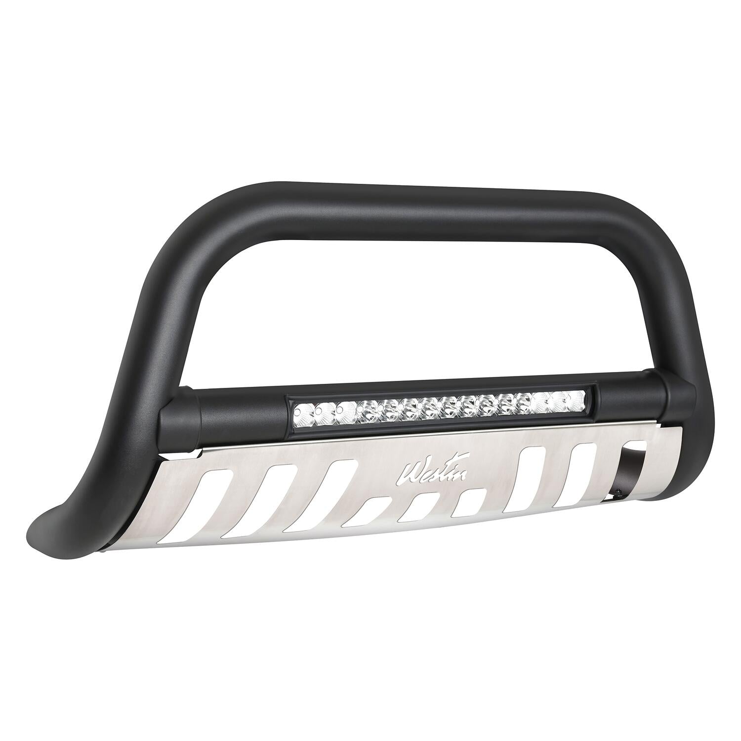 Westins Ultimate LED Bull Bar will take your truck to the next level with this cool new look! The integrated light bar is a 20 single row with 15 x 3 Watt Osram LEDs. The LED light bar is flush mounted in the center cross tube and weather sealed for moisture resistance. Built with 3 steel tubes, our Ultimate LED Bull Bar features molded transition bushings and a brushed stainless steel skid plate for a perfect look. The product is available in chrome plated stainless steel backed by a lifetime warranty, and in textured black powder coat backed by a 3-year warranty. Make a bold statement with Westins new Ultimate LED Bull Bar and give your truck the durability, look and style it deserves.
