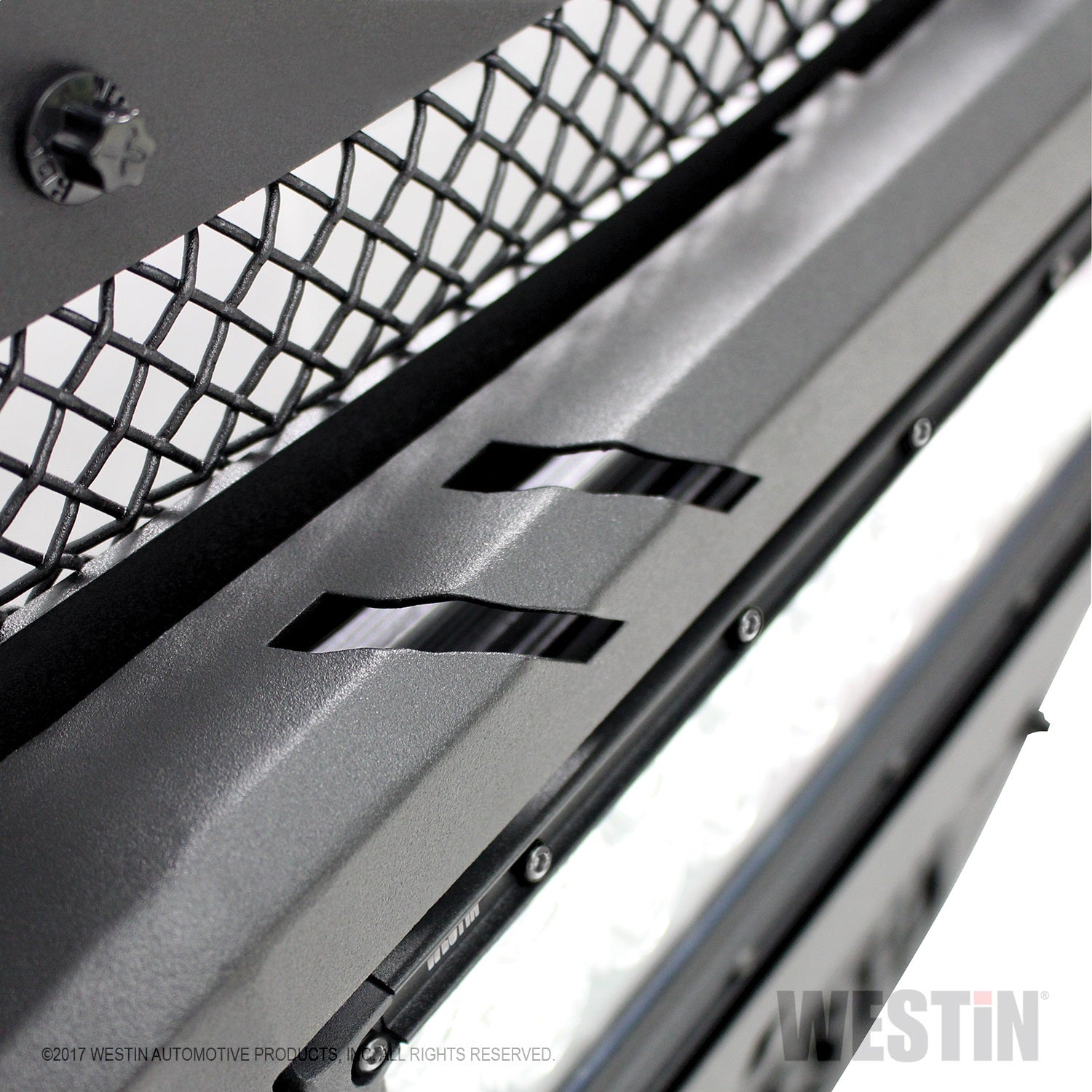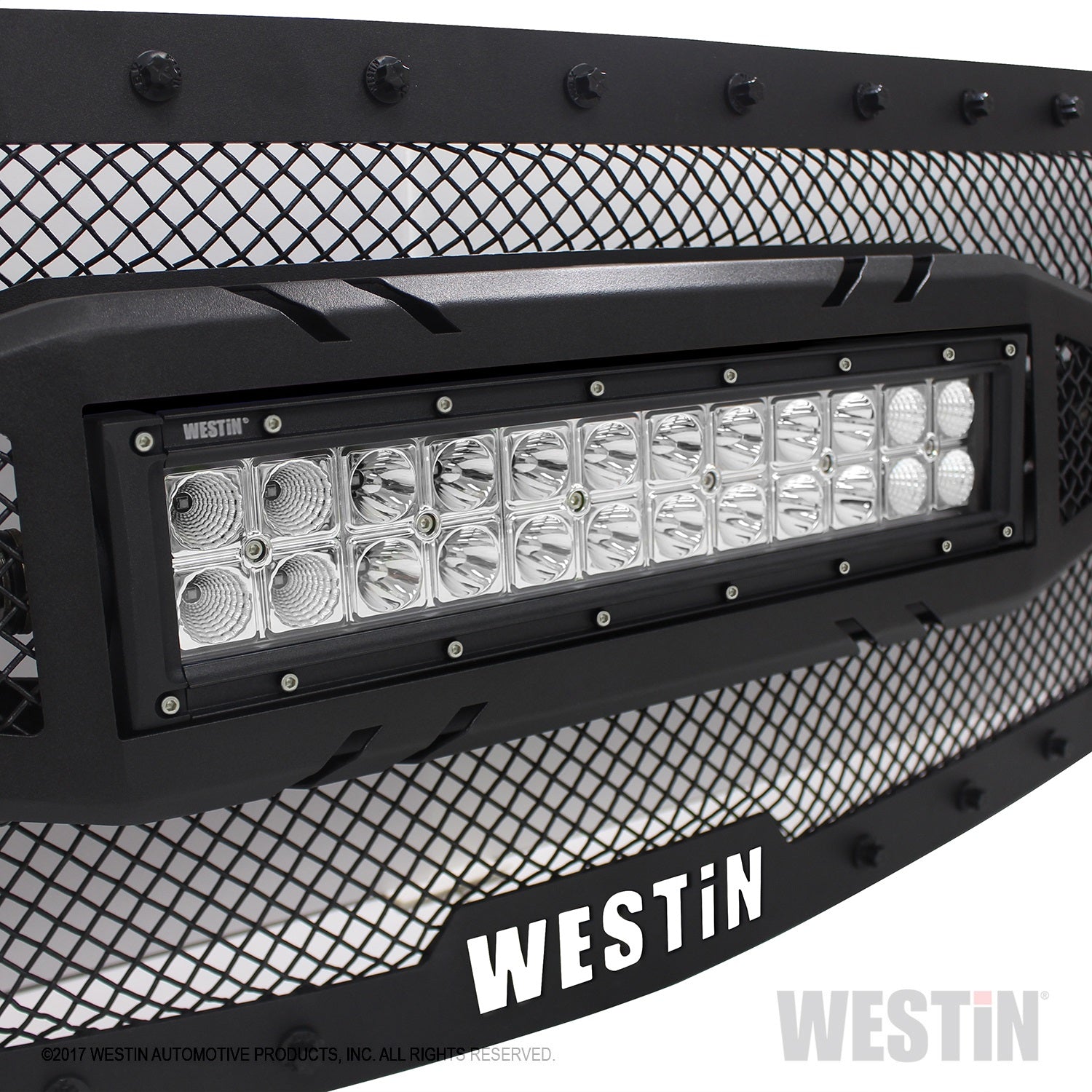 Westin’s HDX LED Grille gives your truck’s front end a whole new look and stylish functionality. Our HDX LED Grilles feature a form fitted mesh grille with laser cut Westin logo and 11 gauge steel frame with LED housing made of 16 gauge steel. Double Row LED Light Bar and 2 Single Row LED Light Bars are included. Westin’s HDX LED Grille also includes black rivets to give your vehicle an aggressive look, and offers easy bolt-on installation so no drilling is required. Product is available in textured black finish.