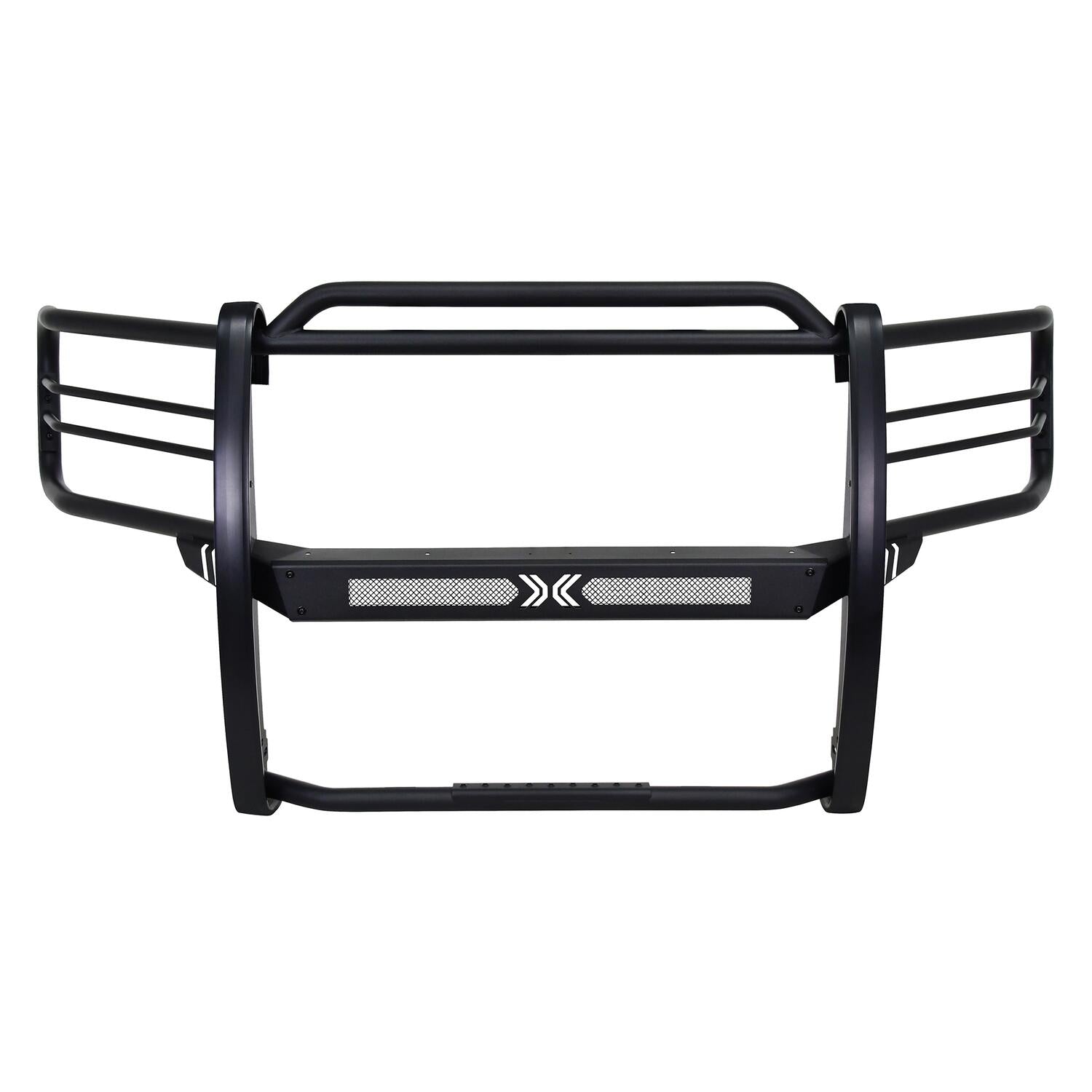 Westins Sportsman X Grille Guard effectively combines aggressive styling with heavy duty front end protection. Engineered to provide both great looks and performance, Sportsman Xs unique design compliments todays larger grille designs, and is available to fit most full and mid size truck applications. Sportsman X has an optional detachable mesh panel (sold separately) which is specifically designed to fit the opening in the center section of Sportsman X Grille Guard, or can be removed to accommodate the flush mounted 26in. dual row LED light bar (sold separately). A smaller removable mesh panel designed for the factory sensor location opening is included as standard with Sportsman X. For specific Chevy and Dodge/RAM applications a Sportsman X Sensor Kit (sold separately) is available. An exterior step plate is located on the 1-5/8in. bottom tube to provide easy access to the engine compartment. Built with heavy duty 2-1/4in. upright rubber strips and 1- 5/8in. outer tubes, Sportsman X Grille Guard is designed to provide protection and style for years to come.