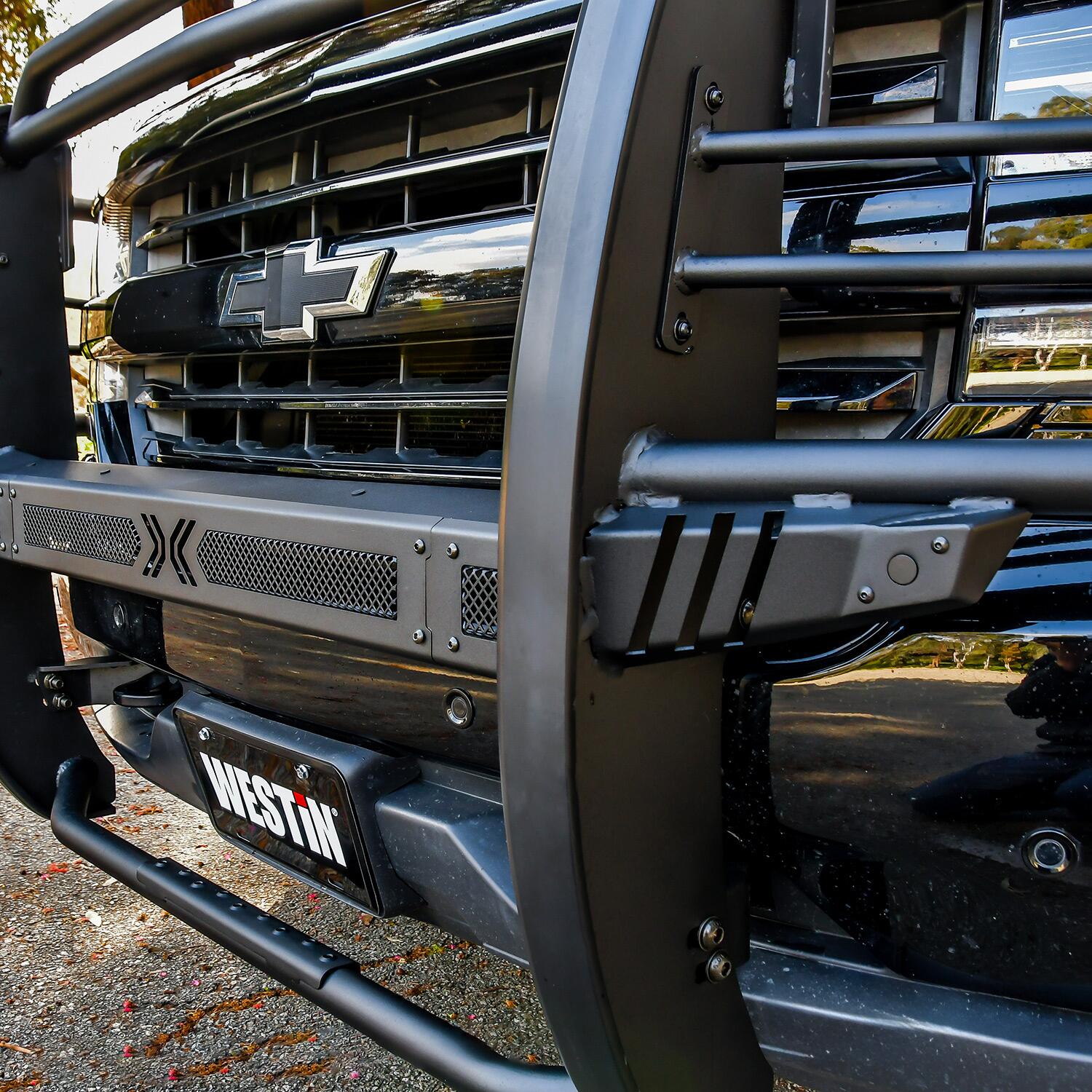 Westins Sportsman X Grille Guard effectively combines aggressive styling with heavy duty front end protection. Engineered to provide both great looks and performance, Sportsman Xs unique design compliments todays larger grille designs, and is available to fit most full and mid size truck applications. Sportsman X has an optional detachable mesh panel (sold separately) which is specifically designed to fit the opening in the center section of Sportsman X Grille Guard, or can be removed to accommodate the flush mounted 26in. dual row LED light bar (sold separately). A smaller removable mesh panel designed for the factory sensor location opening is included as standard with Sportsman X. For specific Chevy and Dodge/RAM applications a Sportsman X Sensor Kit (sold separately) is available. An exterior step plate is located on the 1-5/8in. bottom tube to provide easy access to the engine compartment. Built with heavy duty 2-1/4in. upright rubber strips and 1- 5/8in. outer tubes, Sportsman X Grille Guard is designed to provide protection and style for years to come.