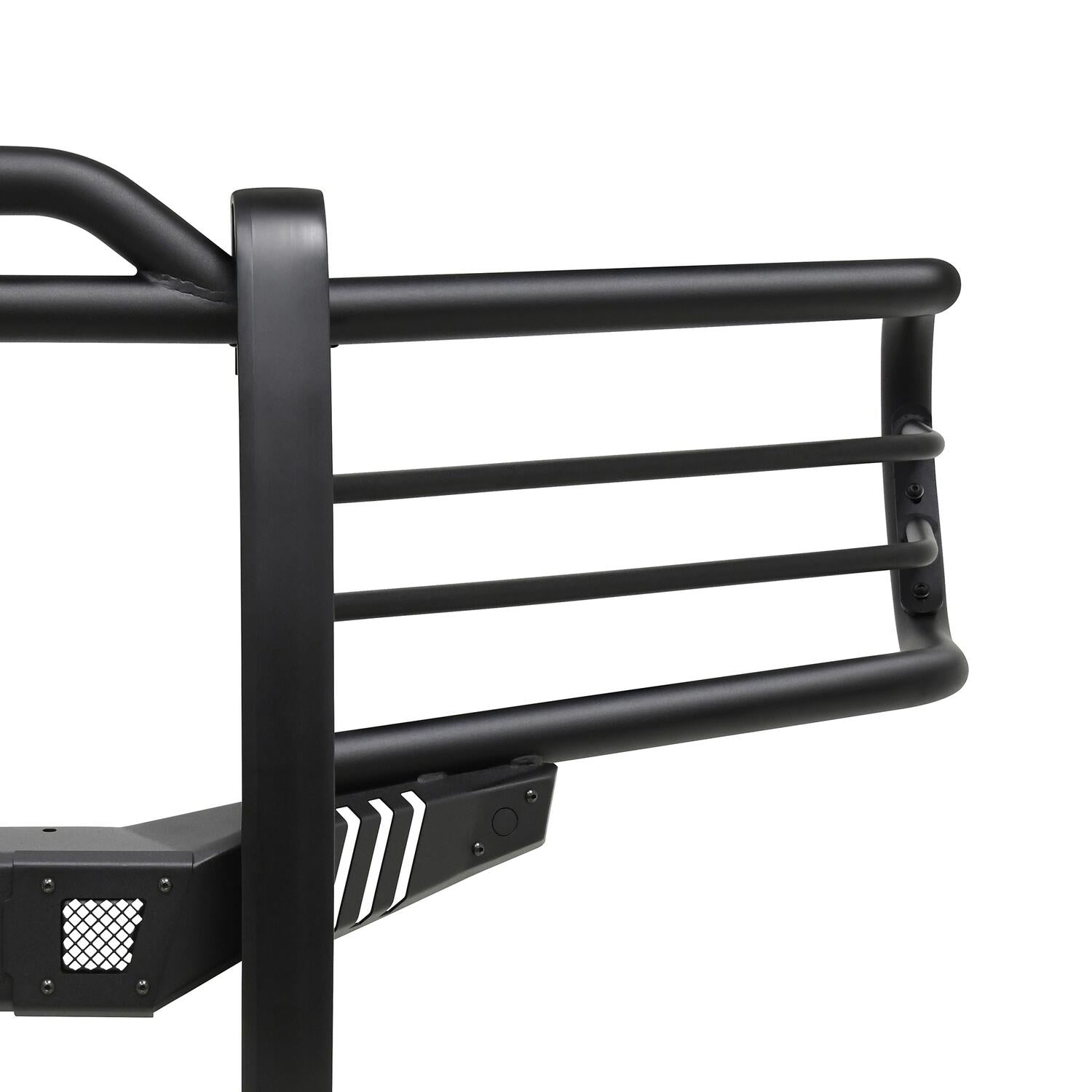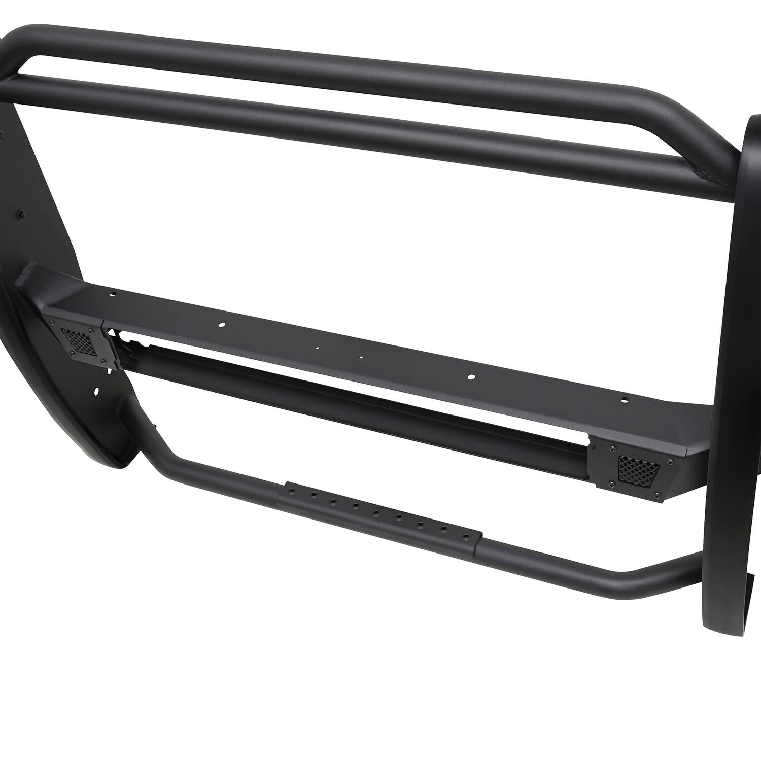 Westins Sportsman X Grille Guard effectively combines aggressive styling with heavy duty front end protection. Engineered to provide both great looks and performance, Sportsman Xs unique design compliments todays larger grille designs, and is available to fit most full and mid size truck applications. Sportsman X has an optional detachable mesh panel (sold separately) which is specifically designed to fit the opening in the center section of Sportsman X Grille Guard, or can be removed to accommodate the flush mounted 26in. dual row LED light bar (sold separately). A smaller removable mesh panel designed for the factory sensor location opening is included as standard with Sportsman X. For specific Chevy and Dodge/RAM applications a Sportsman X Sensor Kit (sold separately) is available. An exterior step plate is located on the 1-5/8in. bottom tube to provide easy access to the engine compartment. Built with heavy duty 2-1/4in. upright rubber strips and 1- 5/8in. outer tubes, Sportsman X Grille Guard is designed to provide protection and style for years to come.