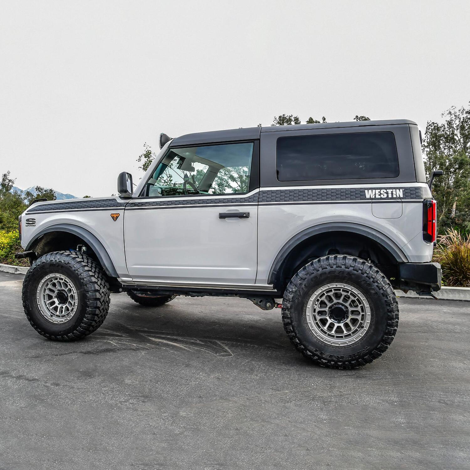 Upgrade your Ford Bronco with the Westin XTS Pinch Weld Covers and experience the perfect blend of styling and protection. Designed to perfection, this accessory is tailored specifically for your Ford Bronco, delivering a head-turning aesthetic upgrade. Available for both 2-door and 4-door Broncos, the Westin XTS Pinch Weld Covers seamlessly integrates with your vehicle's pinch weld, delivering a custom fit that accentuates its sleek design. Constructed from ICNC-cut 16-gauge steel, the Westin XTS Pinch Weld Covers are built to withstand the toughest challenges that come your way. It shields your Bronco's pinch welds from corrosion, dirt, and debris, ensuring they stay flawless for years to come. No matter if you're conquering rugged terrains or navigating city streets, we've got you covered. We understand your time is valuable, so we've made installation a breeze. The Westin XTS Pinch Weld Covers feature a bolt-on design, ensuring a straightforward and secure fit. Mounting hardware is included, saving you time and hassle. We stand behind our products. The Westin XTS Pinch Weld Covers feature an durable textured black powder coat finish with an e-coated base coat, providing long lasting corrosion protection from the harsh weather conditions, and is backed by a 3-year warranty, ensuring your satisfaction and peace of mind.