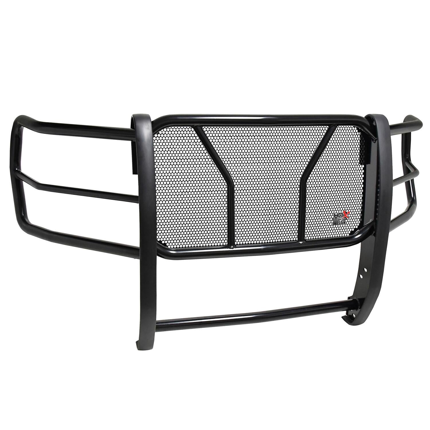 The HDX Grille Guard is the ultimate in extreme truck gear. Its a fully welded 1-piece grille guard that features full wraparound wings made of heavy duty 2in. diameter tube. Uprights are finished and protected with extra wide rubber that is 1/8in. thick and 2 3/4in. wide resulting in a solid clean look. The full punch plate grille protects the vehicles grille area. HDX Grille Guards are available in stainless and black powder coat finish.