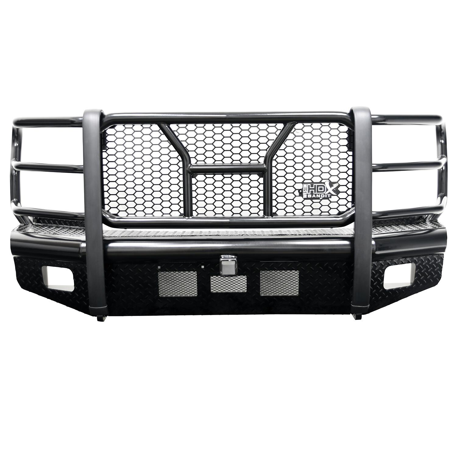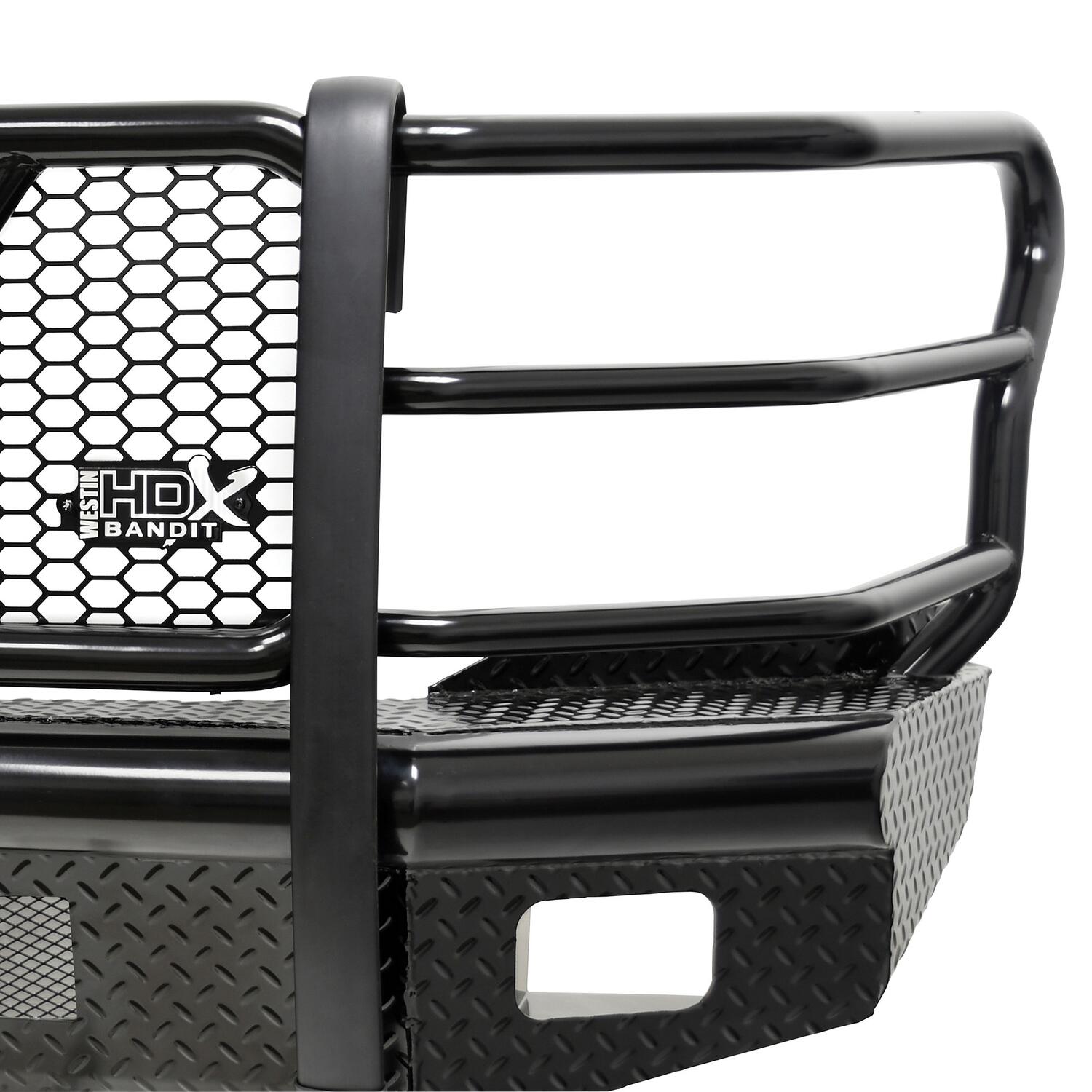 Westins HDX Bandit Bumper combines a heavy duty diamond plate steel bumper constructed of schedule 40 steel pipe with a stylish grille guard featuring 2in. diameter outer wraparound wings and 2 3/4in. wide upright rubber strips. Designed to protect headlights, grille, hood and front fenders from road hazards, debris and wildlife damage. Features a stylish metal honeycomb mesh screen, which allows maximum airflow to the intercooler or radiator area while accenting the front end styling with a clean and rugged look. Removable mesh screens allow for factory camera and adaptive cruise control options available on some late model Ford applications. HDX Bandit Bumper includes a built-in 2in. receiver hitch and (2) heavy duty 9,500 lbs bow shackle mounts, capable of delivering multiple towing options. Compatible for factory fog lamps or LED post mount lights. In addition, some late model Ram and Chevrolet applications feature provisions for factory parking sensors. Bolt-on installation with hardware and mounting brackets included. Available in black powder coat finish.
