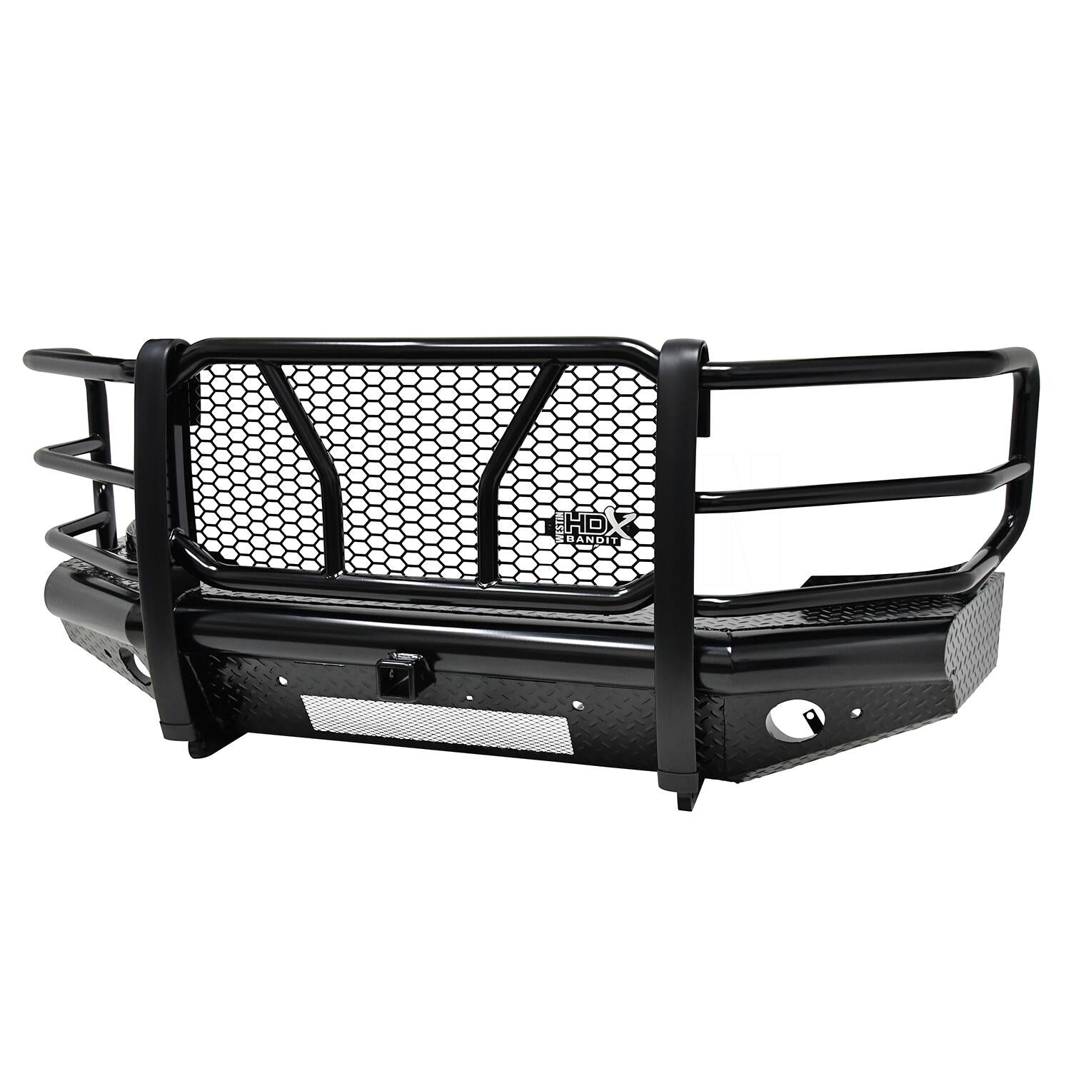 Westins HDX Bandit Bumper combines a heavy duty diamond plate steel bumper constructed of schedule 40 steel pipe with a stylish grille guard featuring 2in. diameter outer wraparound wings and 2 3/4in. wide upright rubber strips. Designed to protect headlights, grille, hood and front fenders from road hazards, debris and wildlife damage. Features a stylish metal honeycomb mesh screen, which allows maximum airflow to the intercooler or radiator area while accenting the front end styling with a clean and rugged look. Removable mesh screens allow for factory camera and adaptive cruise control options available on some late model Ford applications. HDX Bandit Bumper includes a built-in 2in. receiver hitch and (2) heavy duty 9,500 lbs bow shackle mounts, capable of delivering multiple towing options. Compatible for factory fog lamps or LED post mount lights. In addition, some late model Ram and Chevrolet applications feature provisions for factory parking sensors. Bolt-on installation with hardware and mounting brackets included. Available in black powder coat finish.