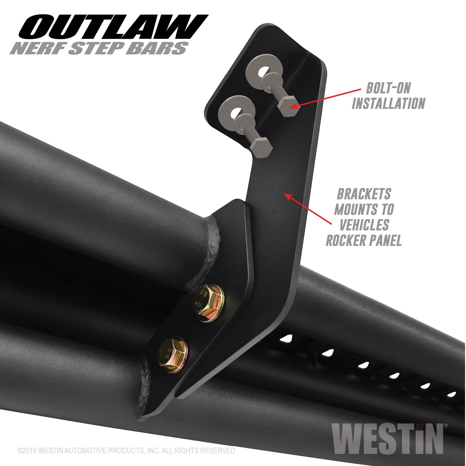Westins Outlaw Nerf Step Bars offer the perfect balance between function and strength resulting in the ultimate rugged look designed to last and impress. Engineered to fit tightly against rocker panels, the Outlaw Nerf Step Bars provide a solid fit and superb protection while simultaneously improving vehicle cab access. Whether you are an avid overlander or simply an off-roader, rest assured you will be safely stepping into your vehicle with a 16 gauge steel coarse step surface and 2 in. diameter tubing. Featuring bolt-on installation, an e-coated base coat and textured black powder coat top finish, Westins Outlaw Nerf Step Bars are the ideal match for the toughest of conditions.