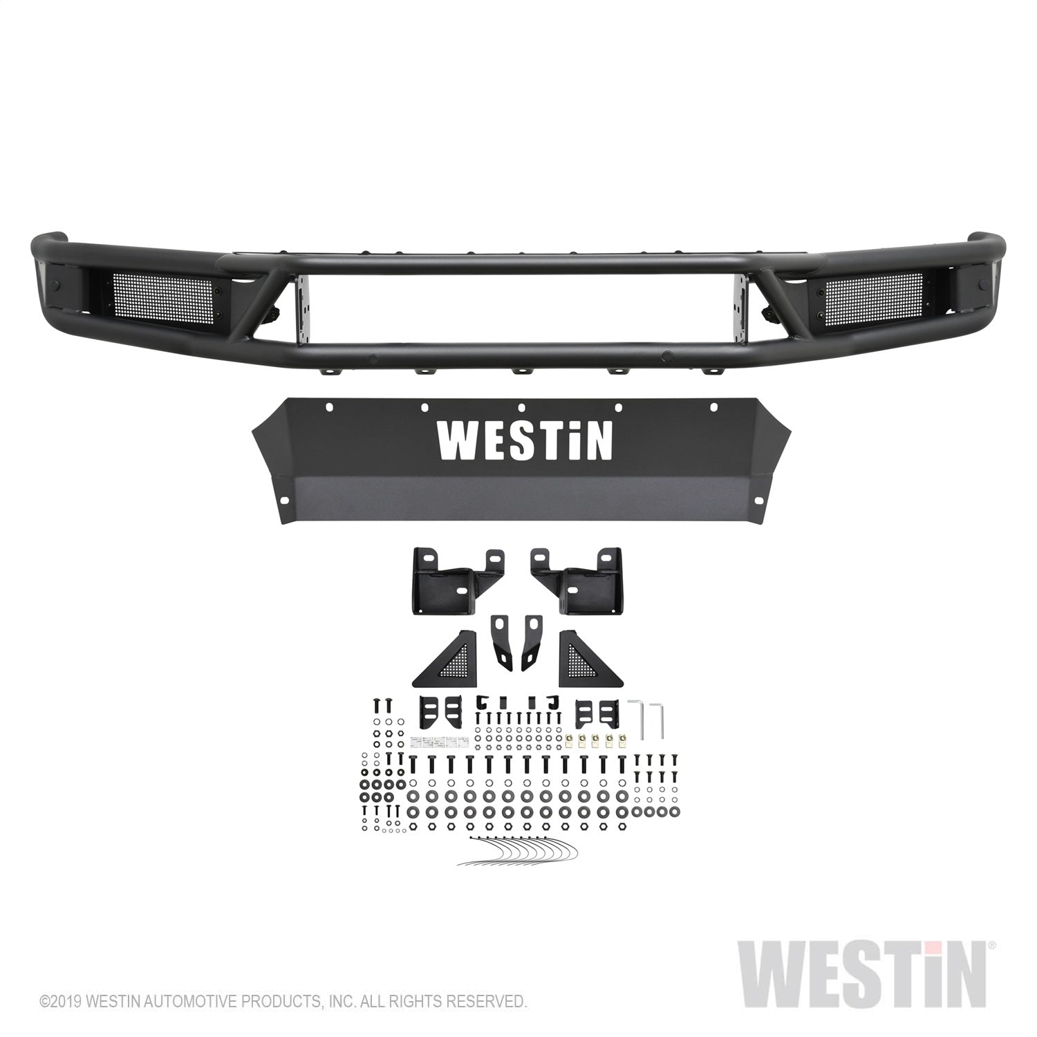 Westins Outlaw Front Bumper is made of strong 14 gauge steel that gives your truck the front end style, durability and function it needs. It features a 2 in. diameter tube frame with 1.5 in. diameter center tubes, and integrated bolt-on LED light mounts for up to two single or one double row 30 in. LED bar. Add an Outlaw Skid Plate or Outlaw LED Light Kit to enhance your vehicles look and strength on and off the road. Round LED Light Kit with Westin Auxiliary Lights or Square LED Light Kit with Westin HyperQ Auxiliary Lights sold separately. Mount kit included. Available in textured black finish.