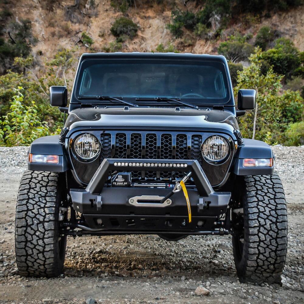 Westins WJ2 Stubby Bumper with LED Light Bar Mount is constructed with 3/16-inch plate steel and features a stout LED light bar mount that accommodates a 20 single row light bar. With Westins new WJ2 Stubby Bumper, your winch fits inside the bumper to allow maximum air flow to your vehicles radiator and is designed to allow winch installation with your bumper already installed -- most other brands wont! Bumper features Rock Light mount points on the lower corners of the bumper as well as 2 side and 2 front off-road jack points. Adjustable brackets accept Westin or competitor light bars. Product offers recovery hooks with a recovery shackle mount point to allow easy tow strap attachment. Optional skid plate and light bars both sold separately. Includes bumper, mounting hardware and install instructions.