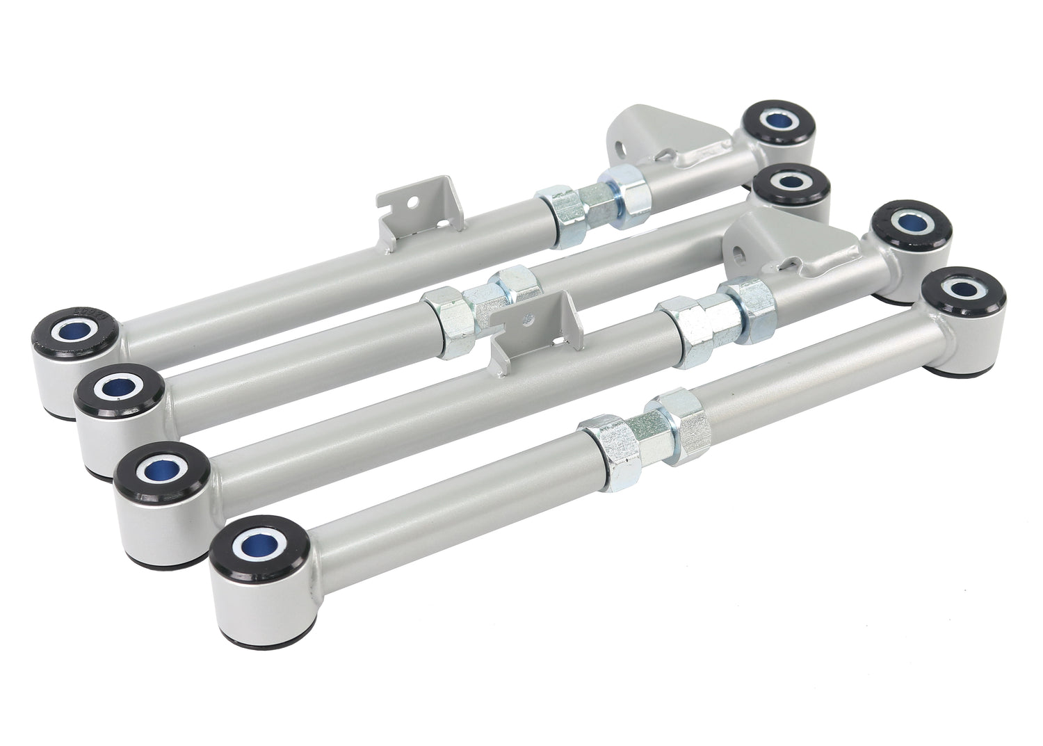 KTA123 is a complete kit of 4 adjustable control arms fitted with low compliance bushings designed to modify rear factory camber - toe and track. The result is greater range and more precise adjustment and a more direct connection between body and rear suspension.