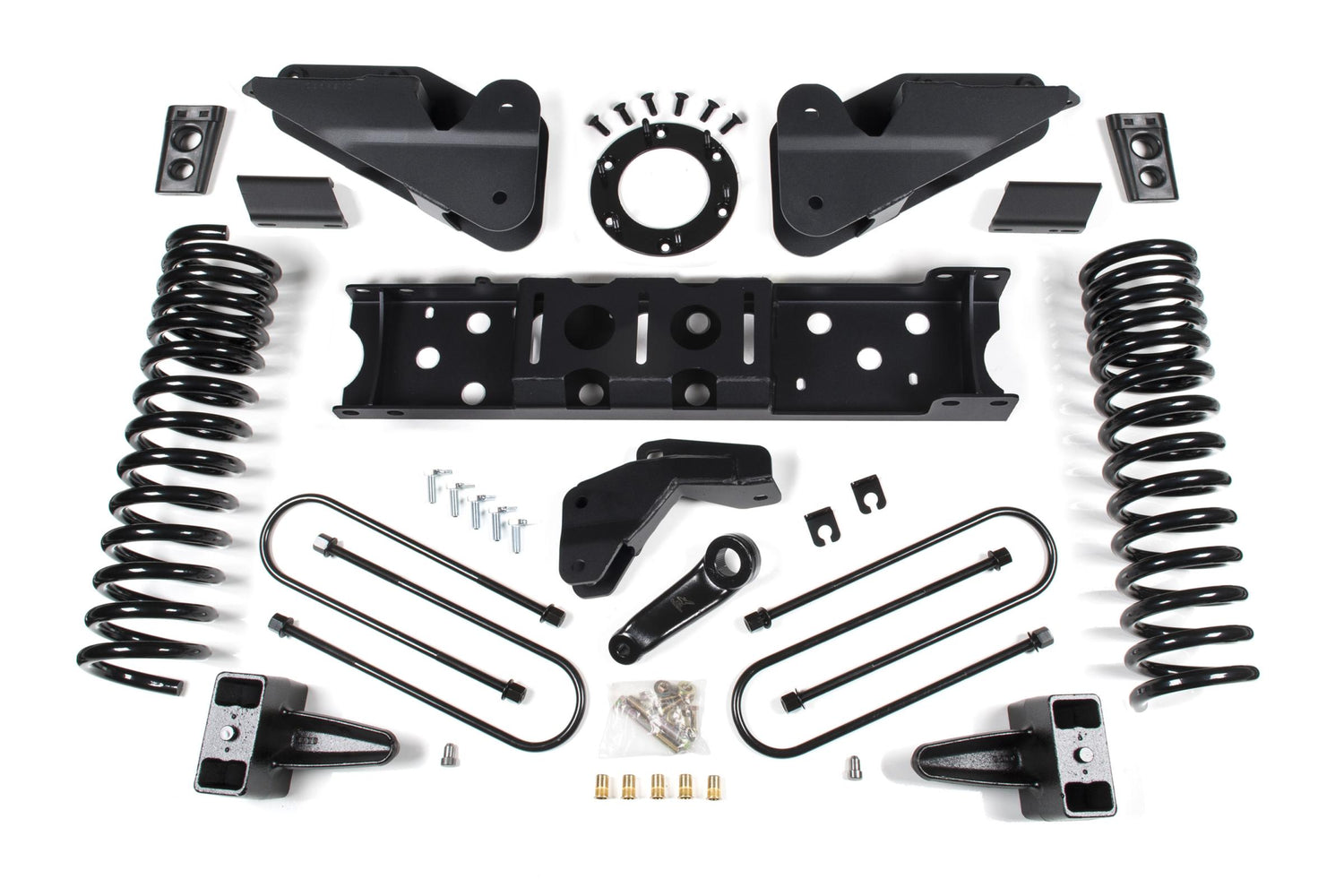 - HD track bar relocation bracket to correctly position front axle under the truck